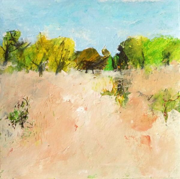 Grasses bleached by this hot summer’s sun fill the local meadows now and fields of barley, which are now stubble fields, are providing some wonderful pale colours when painting en plein air. This is 20x20cm mixed media on paper.