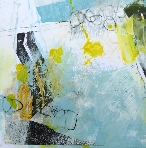 This is one of the paintings that sold during Open Studios Cornwall. The mixed media include acrylic paint and ink, coloured pencils, collage and monoprint on 20x20cm, 250g paper. The subject is intentionally ambiguous but granite stones are featured again suggesting some sort of dilapidated boundary. Yellow with white, black and grey is one of my favourite limited colour palettes..
