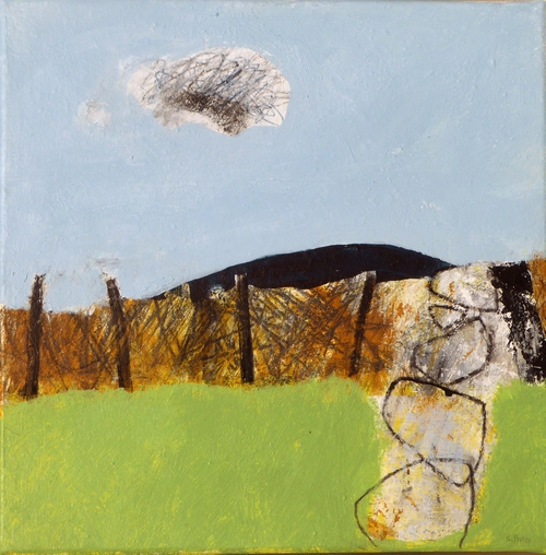 The dark hill is becoming prevalent in my painting these days. It has the stone hedge for compositional company together with a dilapidated bounday creating an ‘improvised enclosure’ which is the title of this mixed media 30x30cm canvas.