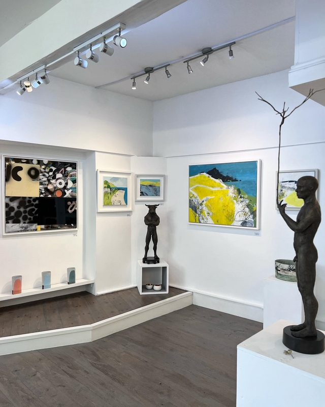 From left – Oliver Teagle ‘Blackjack” (sold), Simon Pooley ‘Perfect Swimming Day’ (sold), ‘Living on the Edge’, ‘Granite Outcrop and Hedges’ (sold) ‘Open Gate’ (sold) with Antonio Lopez Reche’s incredible bronze sculptures and beautiful ceramics by Silvia K, Lamorna Gore and Anna Lambert.’