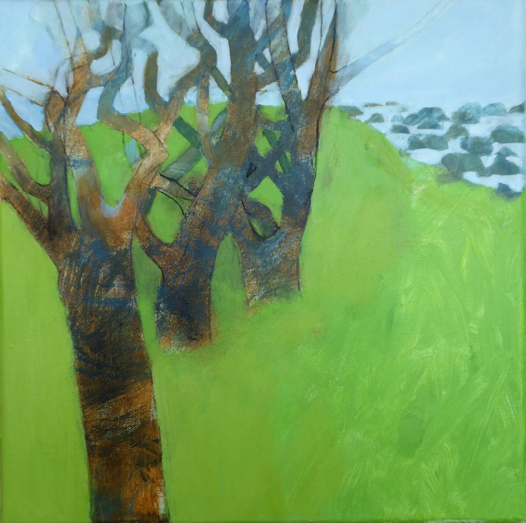 The cove at St Loy is about a mile west of my studio. I used to be able to walk with our dog, Monty, there in about half an hour along the cliff top. It takes a while longer now and I go with our new dog, Frankie (he has ‘blue eyes’). A wood follows a stream until it reaches the cove and its granite boulder shoreline. This painting is not topographically accurate but its how I see it in my mind’s eye. The place has been reduced to its bare essentials. The elements wood, stone, water and air all present.