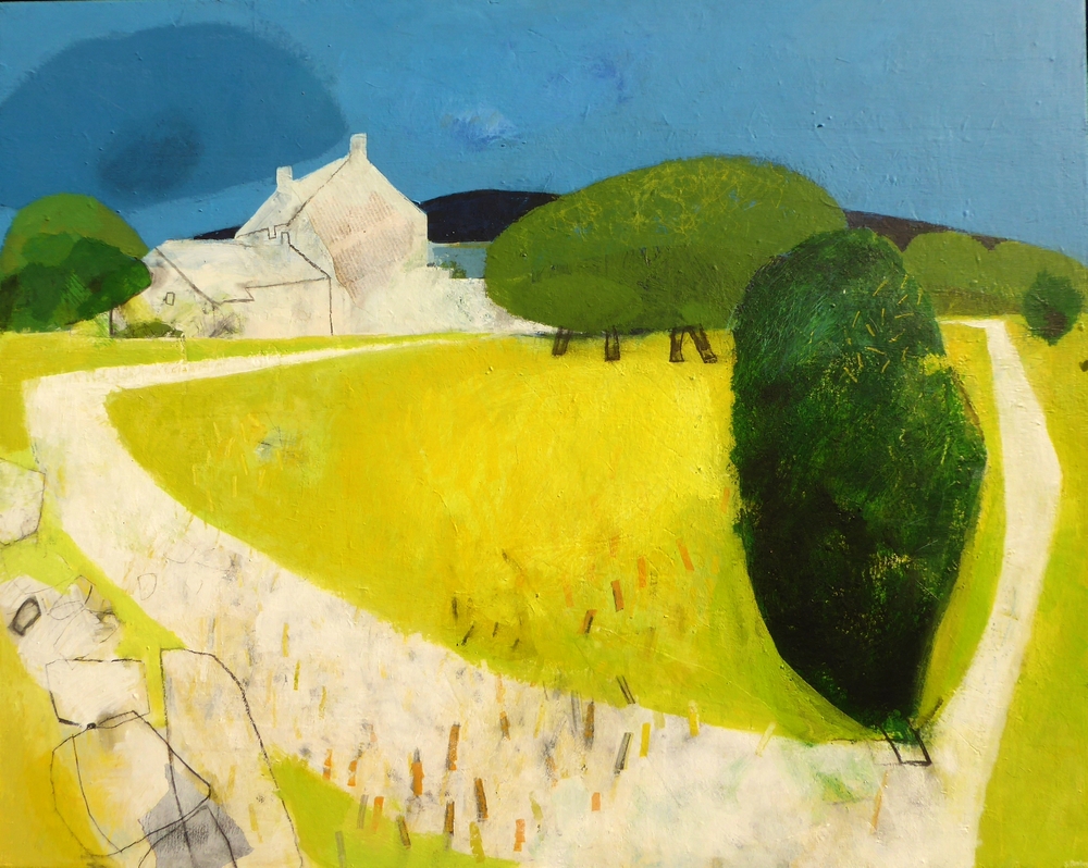‘Beyond Boscowen’ and is mixed media on canvas measuring 80x100cm. Its one of those pieces that has an immediate impact. The strong optimistic and uplifting yellow is set off by the deep blue and greens. The subject can be seen through the window of my studio and our house. I’ve walked around it hundreds of times, usually with Hilary,my wife, and a succession of dogs that accompanied us on our local ramblings over the last 30 odd years. I know this post is not about dogs but I’m going to pay tribute to those that have been with me when inspiration has struck. They are Ross, Monty and now Frankie. If you’re not a dog lover, excuse my digression,